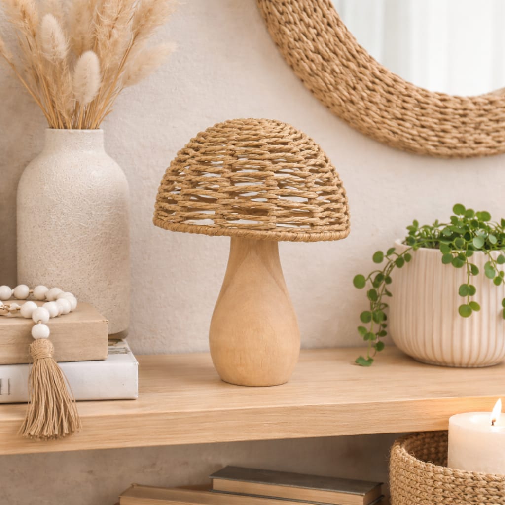 Gracias a su diseño inspirado en la naturaleza, este hongo decorativo es ideal para estilos como boho, nórdico, rústico, mediterráneo y japandi, aunque también puede incorporarse fácilmente en decoraciones contemporáneas que buscan un toque natural. Funciona perfectamente como pieza protagonista o como complemento decorativo en conjunto con otros objetos de fibras, cerámica o madera.