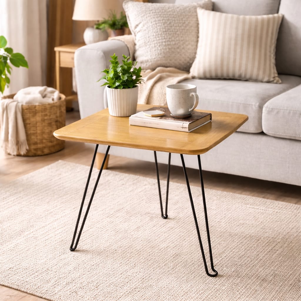 Mesa lateral plegable de bambú 45×45 cm con patas metálicas. Compacta, moderna y funcional para living, dormitorio o balcón.
