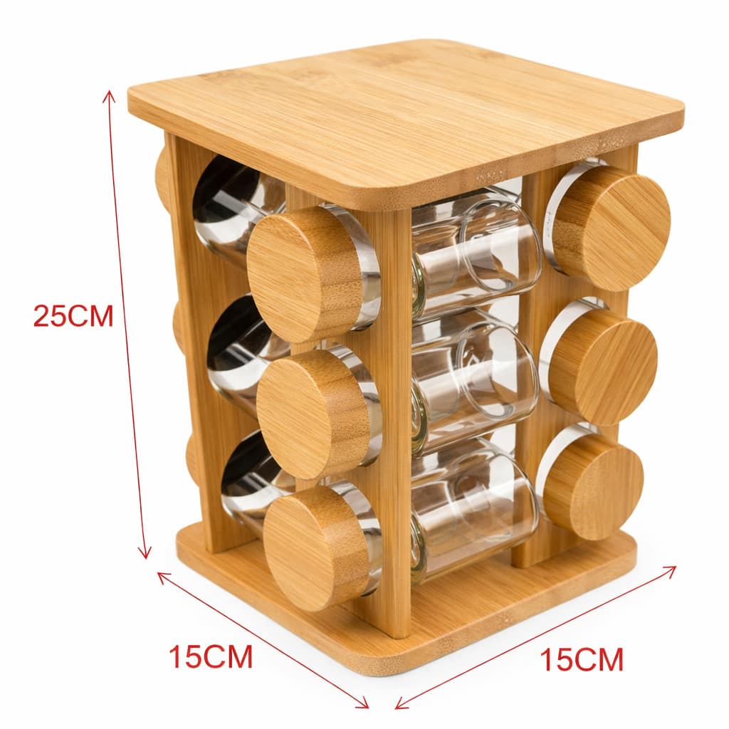 Fabricado con bambú natural de alta calidad, este organizador ofrece resistencia, estabilidad y una estética cálida que combina con cualquier decoración. Los frascos de vidrio transparente permiten visualizar el contenido fácilmente, facilitando la organización diaria de tus especias y condimentos.